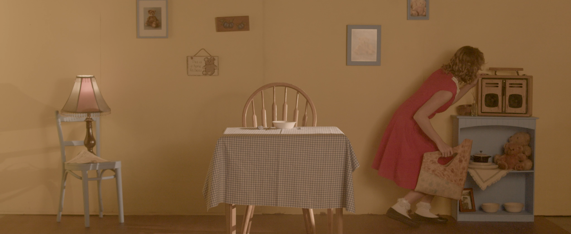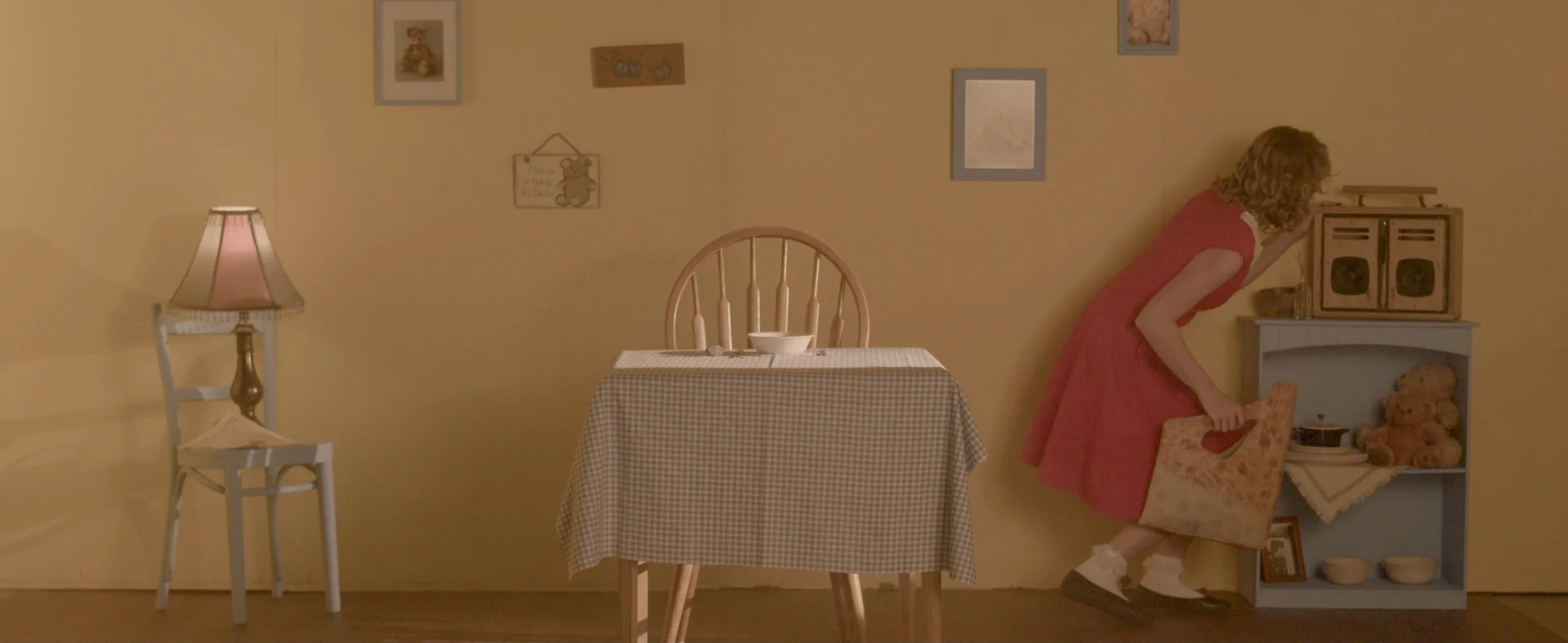 “Pursuit” was an experimental film showcasing various student accessory designer's work. The story follows a young girl who jumps through various childrens fairytales in attempt to retrieve her stolen purse. The production design was extremely involved and consisted of painting and transporting 8x8 ft walls, sourcing and painting furniture etc. Along with being head production and costume designer, I also co-wrote and helped produce this film.